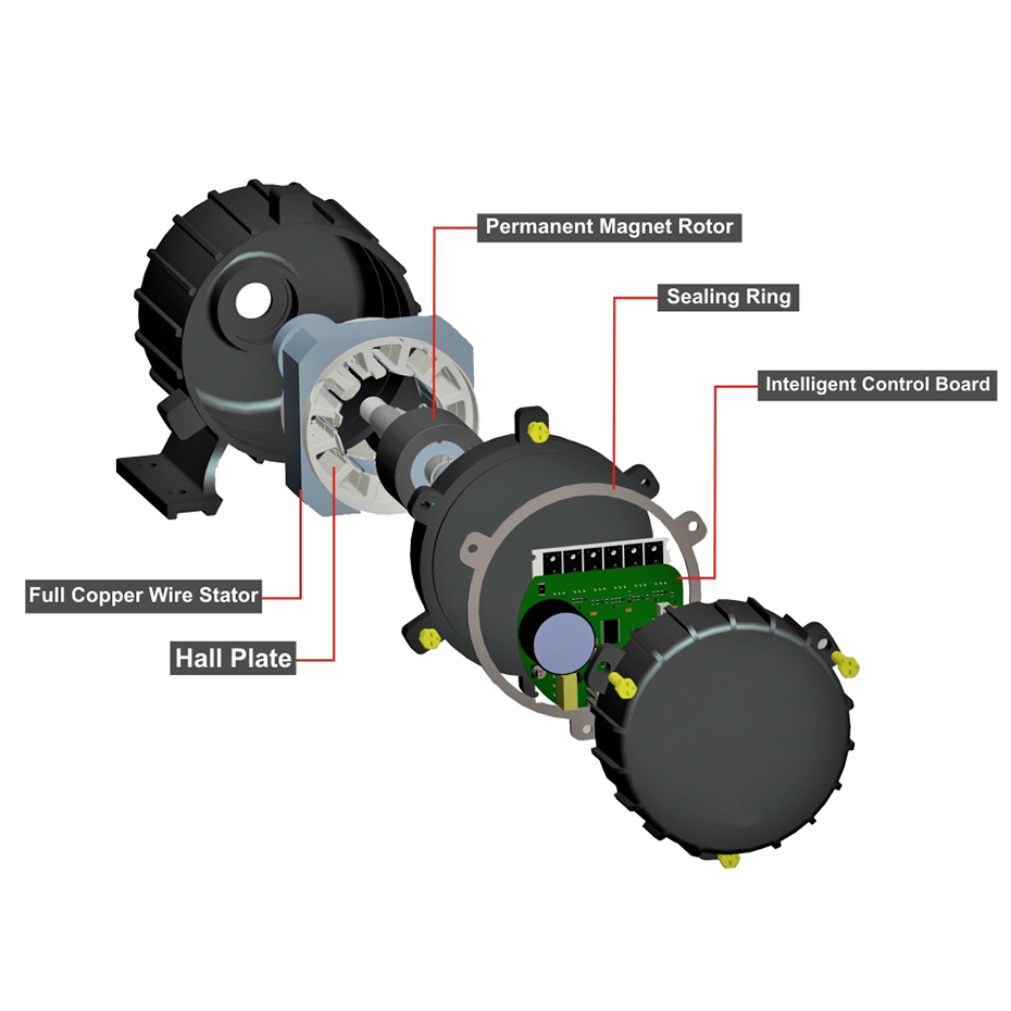El motor CC sin escobillas no tiene estructura de conmutador mecánico y el interior tiene un diseño completamente sellado, lo que logrará un motor a prueba de polvo, aceite, humo y que no se queme..